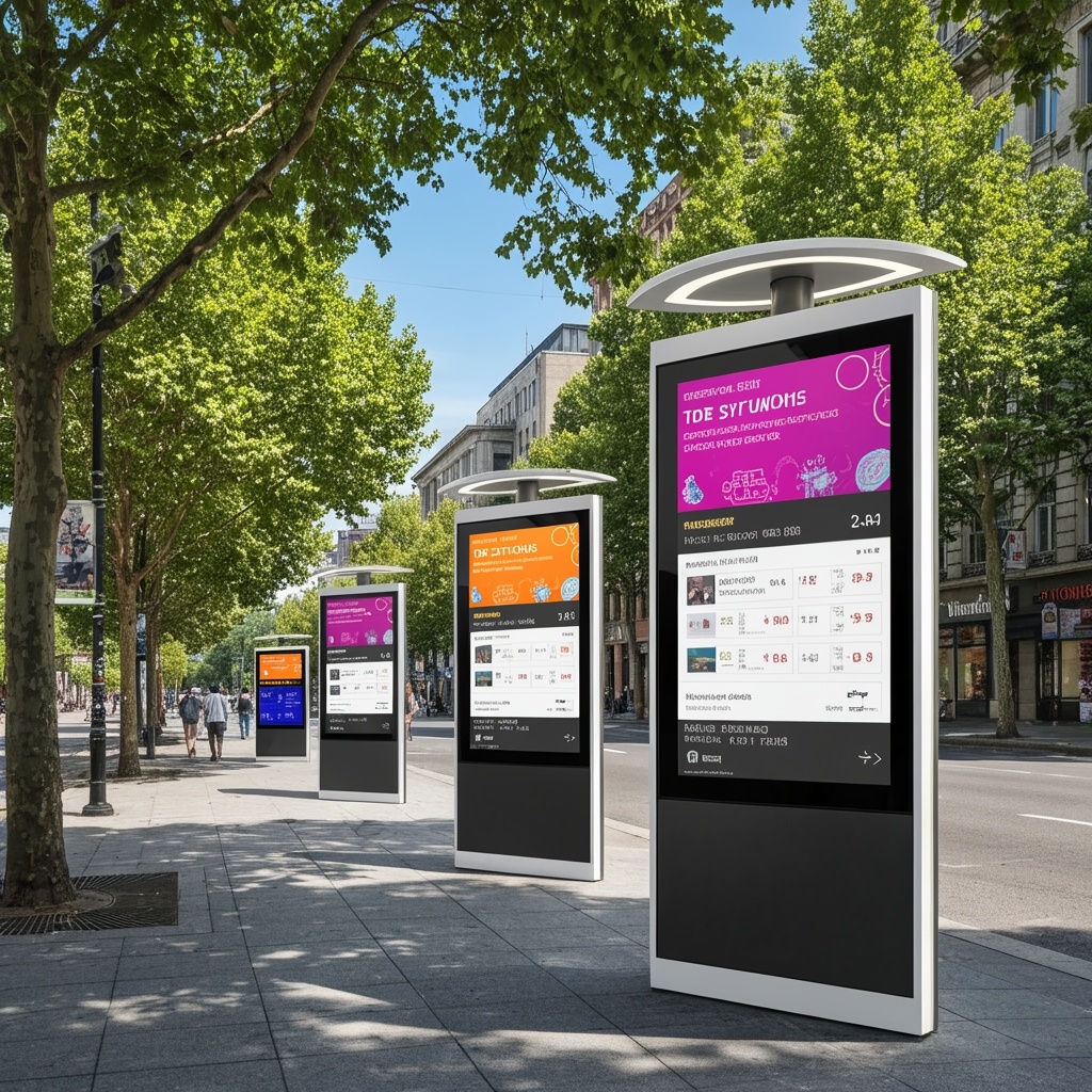 Advertisement digital glass panels placed on urban public amenities like bus shelters, kiosks, and newsstands, transforming them into advertising platforms. Their purpose is to reach pedestrians and drivers in high-traffic areas.